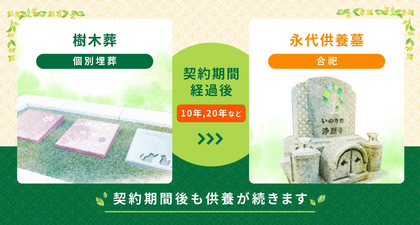 ※樹木葬に埋葬された時点から供養を行います(毎年春・秋のお彼岸に合同供養)。なお、供養は永代供養墓へ移ってからも継続されます。