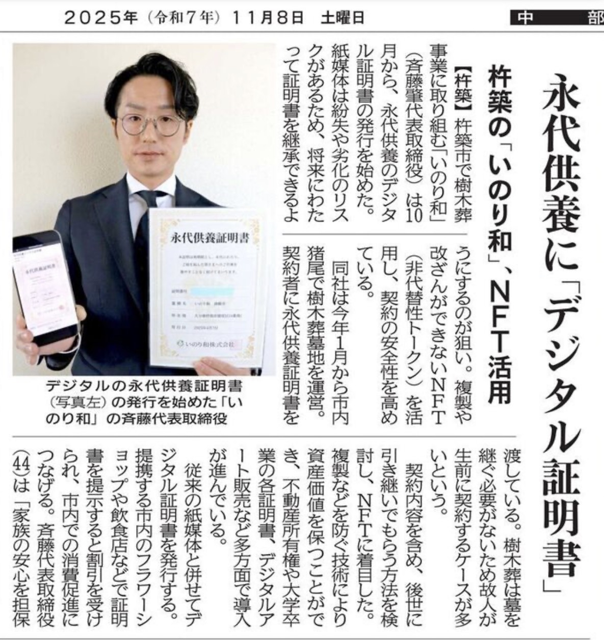 いのり和の「永代供養証明書(NFT版)」の取り組みが掲載されました。
